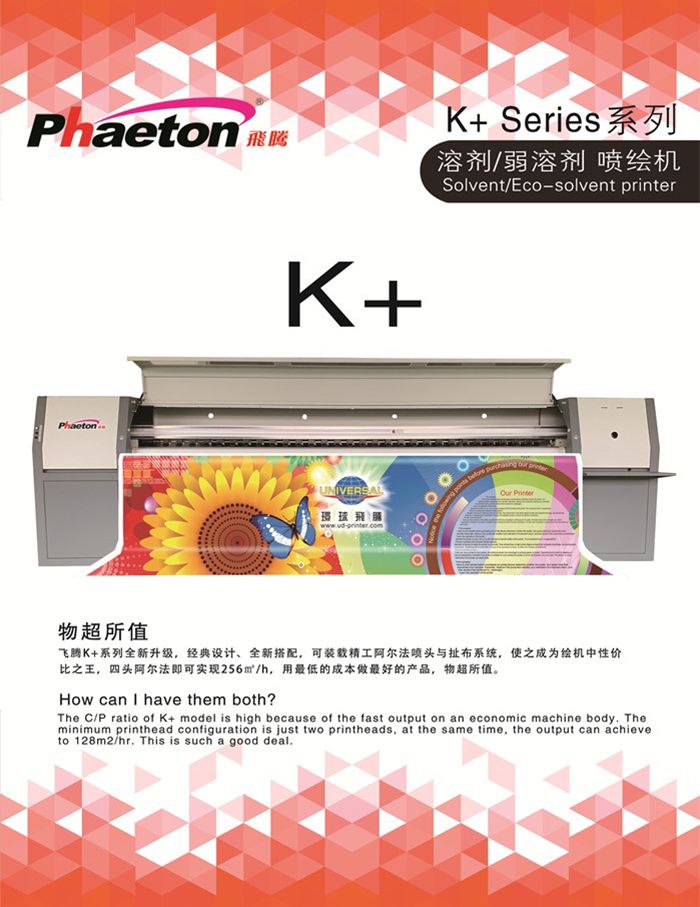 飛騰K+系列全新升級,經典設計、全新搭配,可裝載精工阿爾法噴頭與扯布系統,使之成為繪機中性價比之王,四頭阿爾法即可實現256㎡/h,用最低的成本做最好的產品,物超所值。
